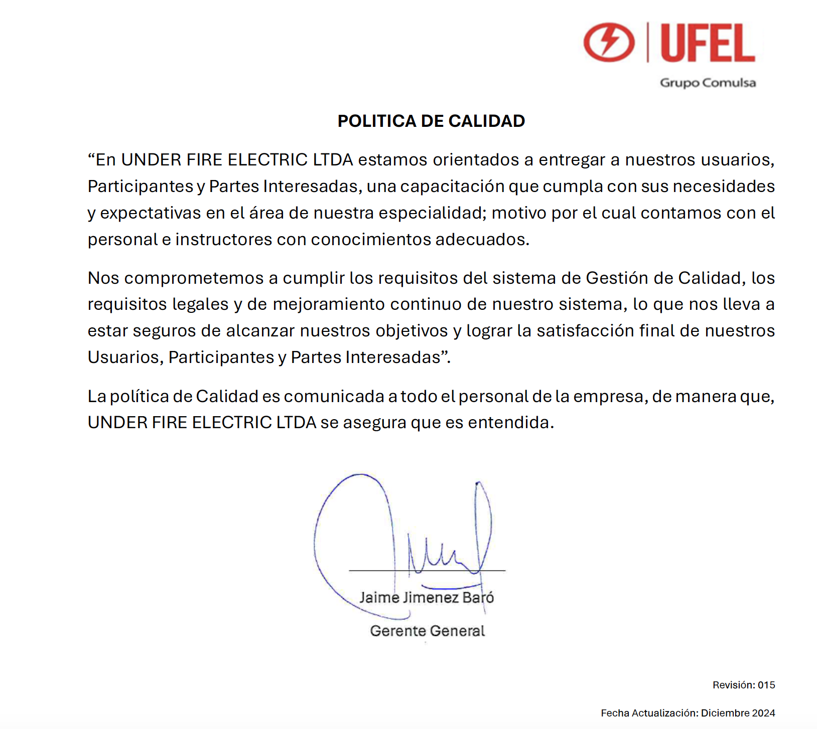 La política de Calidad es comunicada a todo el personal de la empresa, de manera que, UNDER FIRE ELECTRIC LTDA se asegura que es entendida.